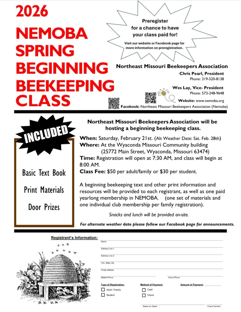 📣Want a chance to have your class paid for? All you have to do is preregister by emailing us your information (Name, Address, Email Address, Phone Number, and number of attendees in your party). Email may be sent to nemobeekeepers@gmail.com